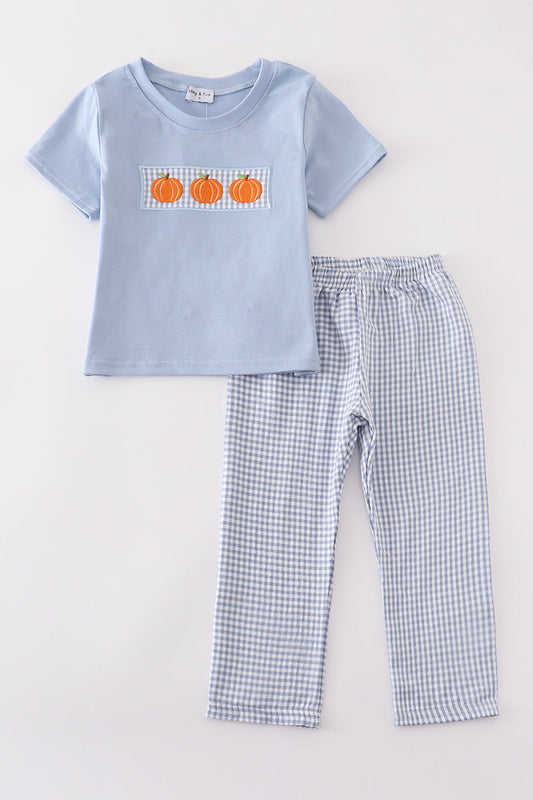 Blue Gingham Pumpkin Embroidery Boy Set